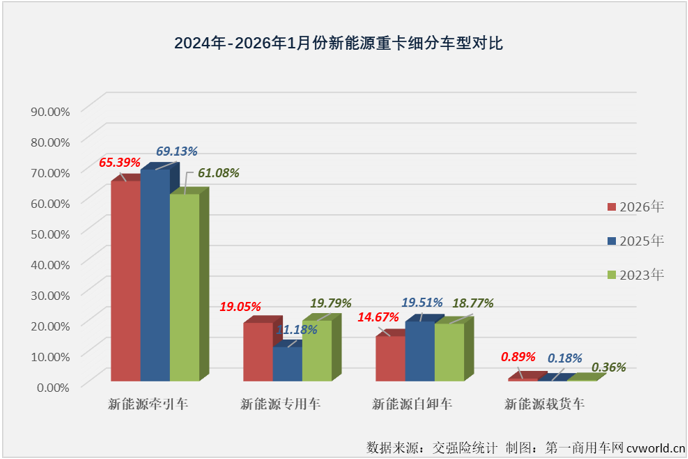 2026年1月份,新能源牵引车在新能源重卡市场占到65.39%的份额,较其2025年全年76.36%的占比低了超10个百分点,与去年1月份(69.13%)相比也低了近5个百分点(如上图)。根据第一商用车网的观察, 2025年,牵引车在新能源重卡单月销量结构占比持续高位, 全年有11个月占比超过70%,从这个角度看,今年1月份新能源牵引车市场“火力”是有所下降的。