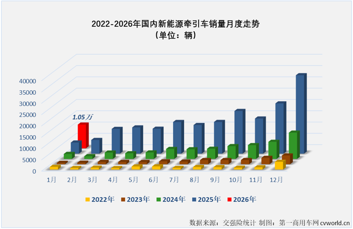 从最近几年国内新能源牵引车销量月度走势图可见,代表2026年1月的红色柱体比之前任何一年的1月份都“高”出一大截,但这一高度放在2025年看并不突出,甚至明显低于平均水平(2025年新能源牵引车平均月销量达到1.47万辆)。