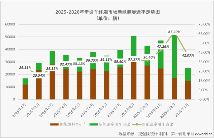 受2025年底政策“冲量”影响,2026年1月份,国内重卡市场终端需求环比出现明显下滑,整体实销仅4.84万辆,环比下降42%,其中牵引车实销2.50万辆。1月份新能源牵引车在牵引车终端销量的占比达到42.07%,与2025年全年占比(38.47%)相比提升了接近4个百分点,与去年同期占比相比则是大幅提升了接近13个百分点(如上图)。