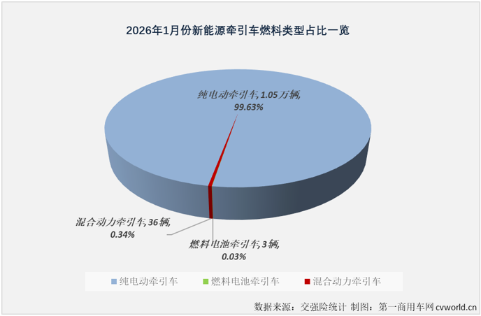 从燃料种类看,2026年首月新能源牵引车技术路线仍以纯电动为主,这与整个新能源重卡市场情况完全相同。2026年1月份,在全国各地挂牌上路的1.05万辆新能源牵引车几乎都是纯电动牵引车(其中有3943辆为换电牵引车),33辆燃料电池牵引车和36辆混合动力牵引车,占比分别为99.63%、0.03%和0.34%。