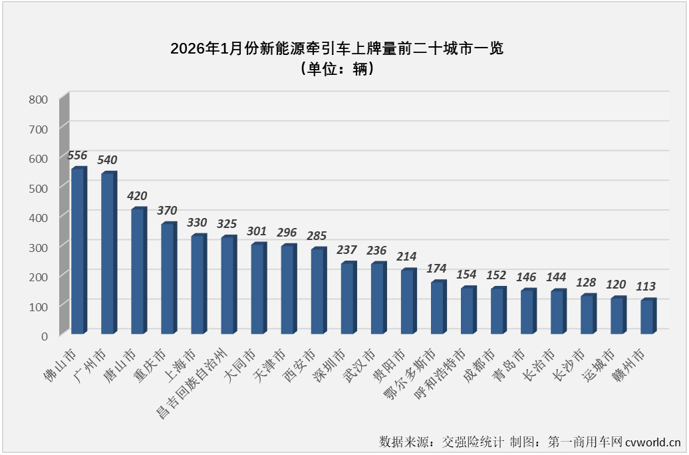 2026年首月,全国共有29个省级行政区有新能源牵引车挂牌上路,区域分布呈现不均衡的状态,2026年1月份上牌量前4位的广东、山西、河北和新疆上牌量均超过600辆,上述4省(市)合计分走了1月份新能源牵引车终端销量的1/3以上(35.9%)。具体到城市来看,2026年1月份新能源牵引车上牌量靠前的城市有佛山、广州、唐山、重庆、上海、昌吉、大同等市。
