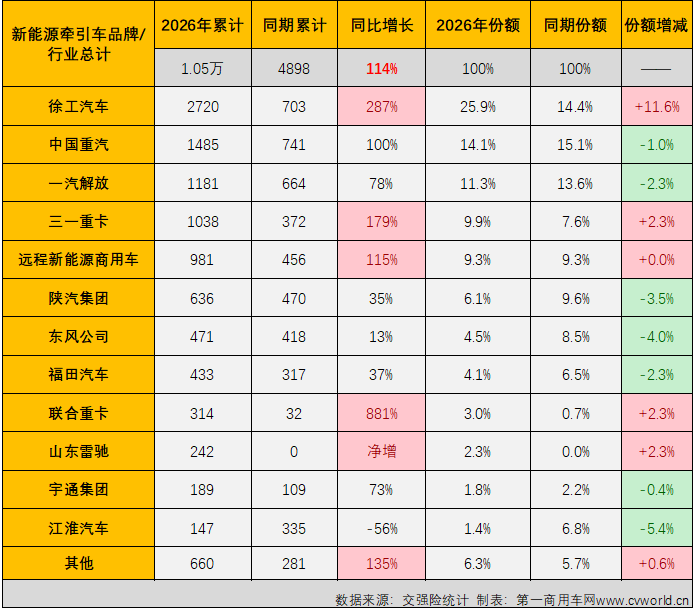 2026年首月,新能源重卡市场以同比大增127%的表现开局,新能源牵引车市场同步实现翻倍增长,同比增速达到114%。无论是市场整体的翻倍大增,还是各家企业的翻倍增长、数倍增长,都预示着2026年新能源牵引车市场新一轮继续向上的“浪潮”已经开启,请与本站一起保持关注。