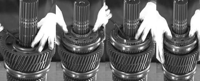 将同步器结合齿毂缺齿对齐主轴宽齿槽装入同步器总成,保证同步器结合齿 圈与齿轮内花键结合。